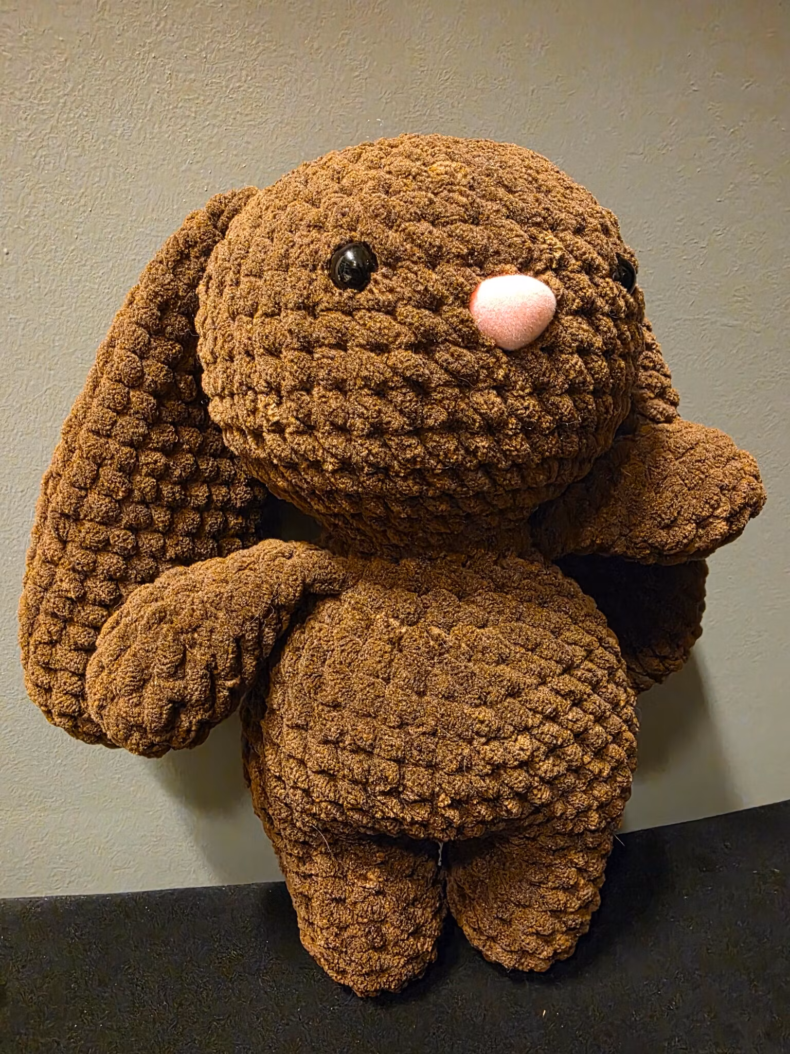 Han er heklet i mykt bamsegarn, som gjør ham ekstra deilig å holde rundt – perfekt som kosevenn, gave eller pynt på barnerommet.